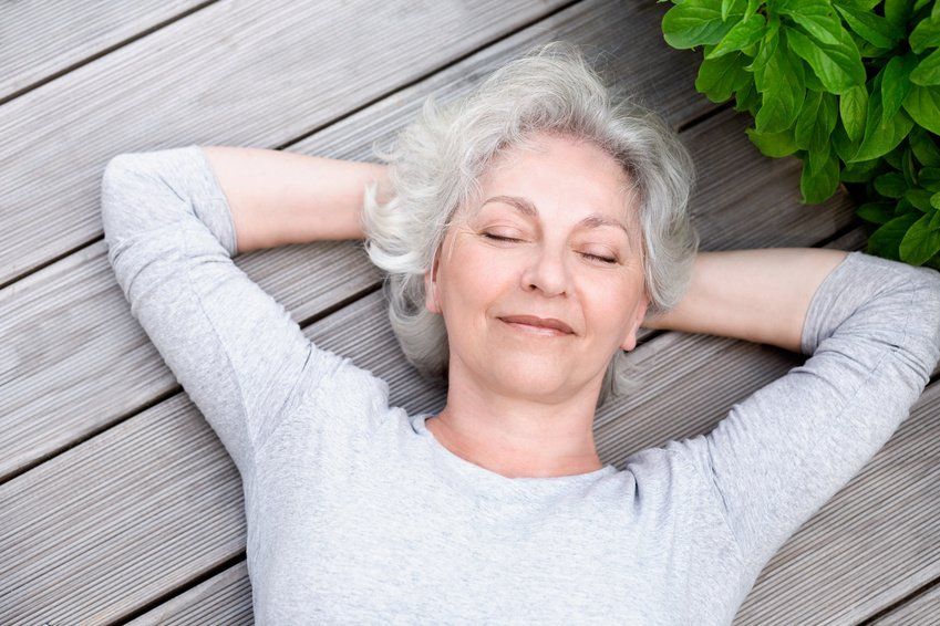 © jd-photodesign - Fotolia.com, #51331049, Titel: grauhaarige Frau entspannt auf der Terasse